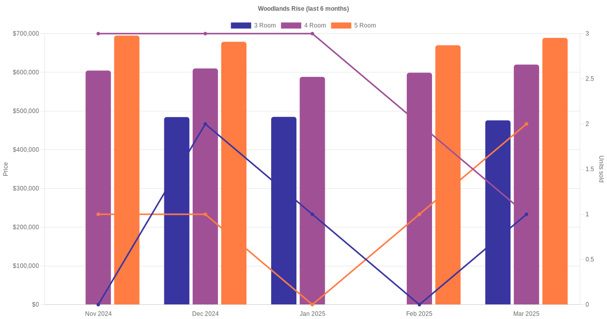 Located along Woodlands Rise are various HDB flat types including 3 room, 4 room and 5 room units. Shown below is a view of the resale price and transactions trends, broken down by month, in the last 3 years.
