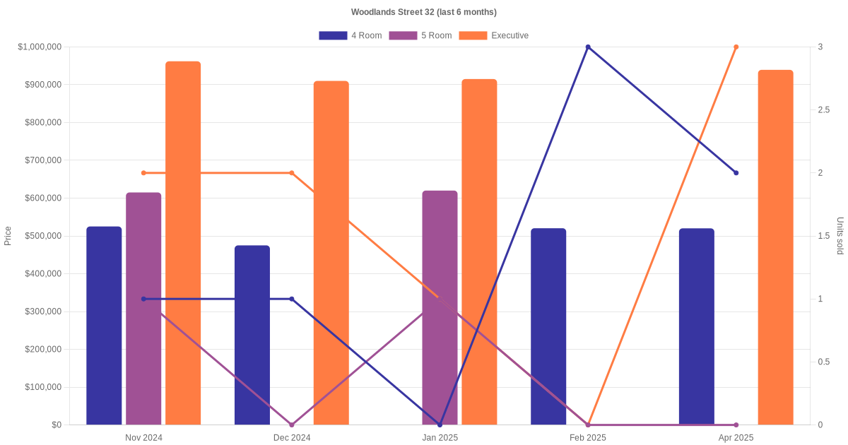 Located along Woodlands Street 32 are various HDB flat types including 4 room, 5 room and executive units. Shown below is a view of the resale price and transactions trends, broken down by month, in the last 3 years.