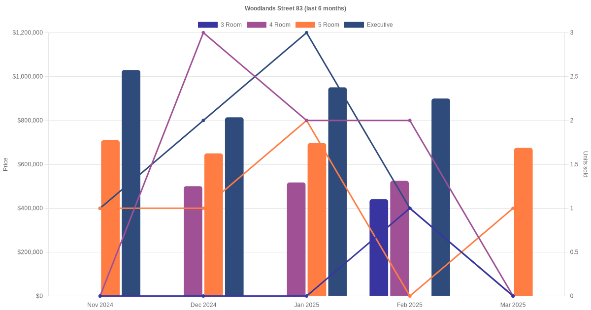 Located along Woodlands Street 83 are various HDB flat types including 3 room, 4 room, 5 room and executive units. Shown below is a view of the resale price and transactions trends, broken down by month, in the last 3 years.