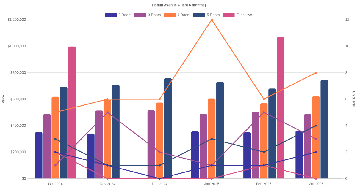 Located along Yishun Avenue 4 are various HDB flat types including 2 room, 3 room, 4 room, 5 room, executive and multi-generation units. Shown below is a view of the resale price and transactions trends, broken down by month, in the last 3 years.