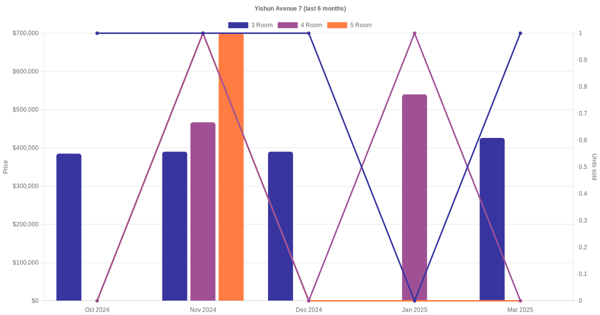 Located along Yishun Avenue 7 are various HDB flat types including 3 room, 4 room and 5 room units. Shown below is a view of the resale price and transactions trends, broken down by month, in the last 3 years.