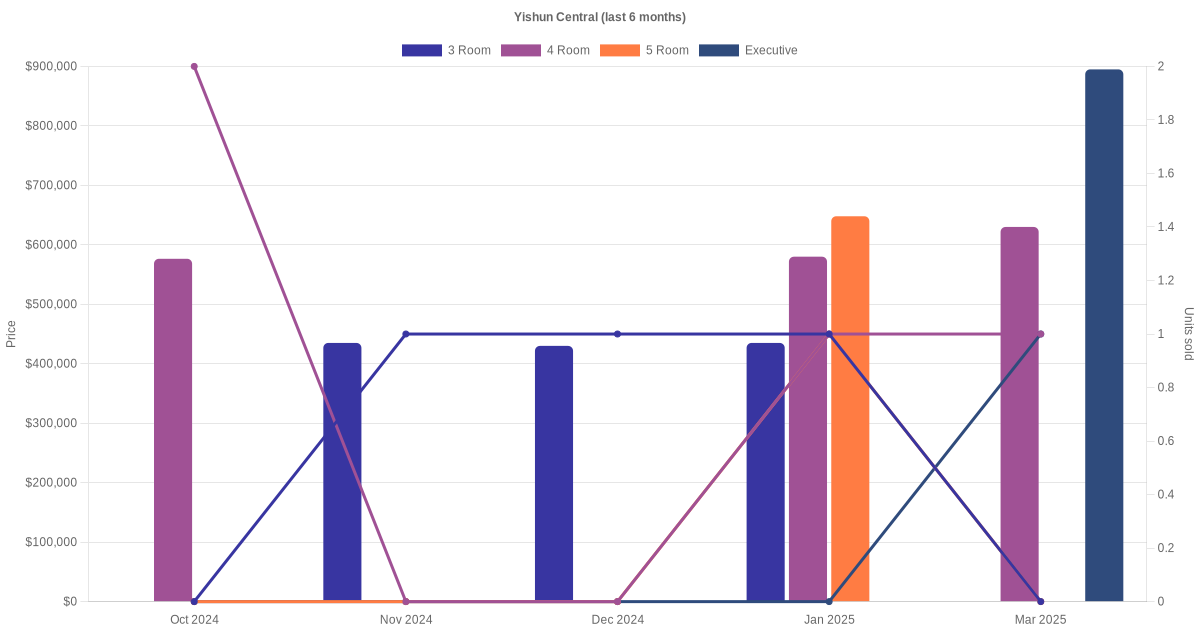 Located along Yishun Central are various HDB flat types including 3 room, 4 room, 5 room and executive units. Shown below is a view of the resale price and transactions trends, broken down by month, in the last 3 years.
