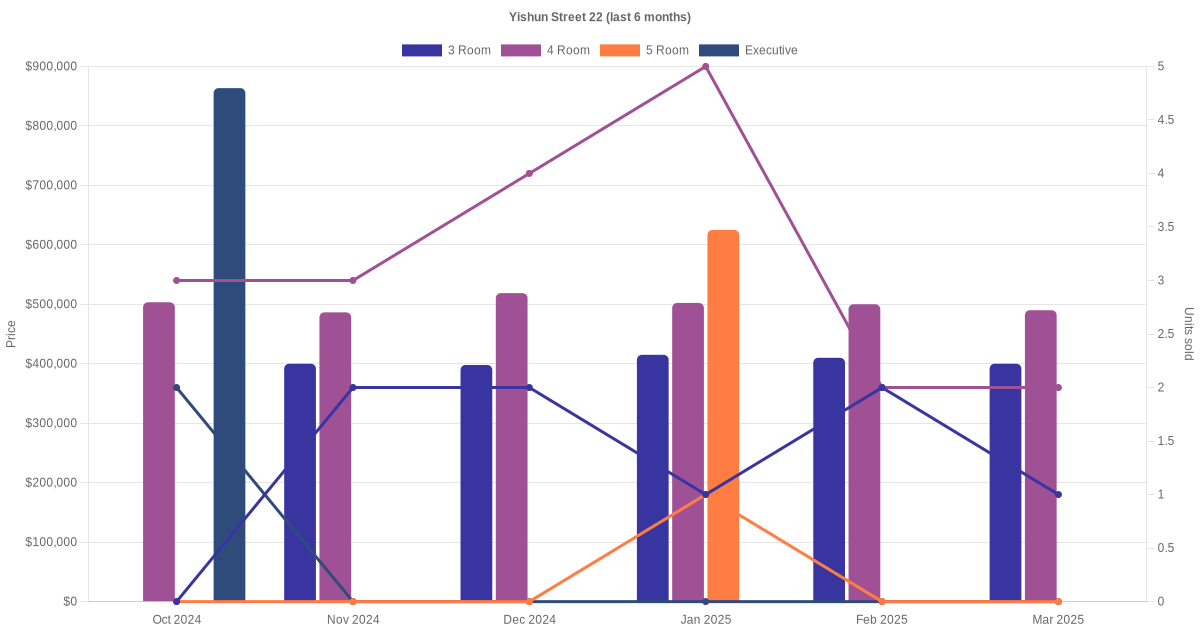 Located along Yishun Street 22 are various HDB flat types including 3 room, 4 room, 5 room and executive units. Shown below is a view of the resale price and transactions trends, broken down by month, in the last 3 years.