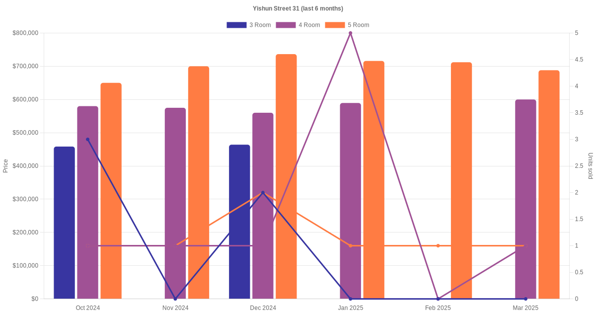 Located along Yishun Street 31 are various HDB flat types including 3 room, 4 room and 5 room units. Shown below is a view of the resale price and transactions trends, broken down by month, in the last 3 years.