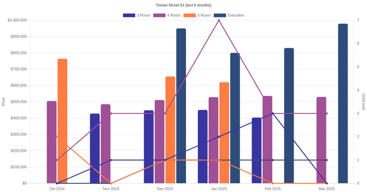 Located along Yishun Street 61 are various HDB flat types including 3 room, 4 room, 5 room, executive and multi-generation units. Shown below is a view of the resale price and transactions trends, broken down by month, in the last 3 years.