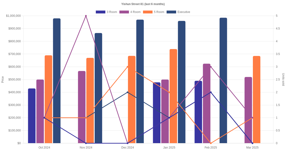Located along Yishun Street 81 are various HDB flat types including 3 room, 4 room, 5 room and executive units. Shown below is a view of the resale price and transactions trends, broken down by month, in the last 3 years.