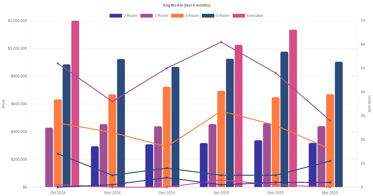 In the last 3 years, the average monthly transacted resale price trend for 2 room, 3 room, 4 room, 5 room and executive units in Ang Mo Kio has been summarised as shown below.