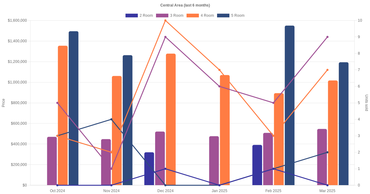 Central Area comprises 2 room, 3 room, 4 room, 5 room and executive HDB units. Shown below are the transactions volume trend summary and graph, broken down by month.