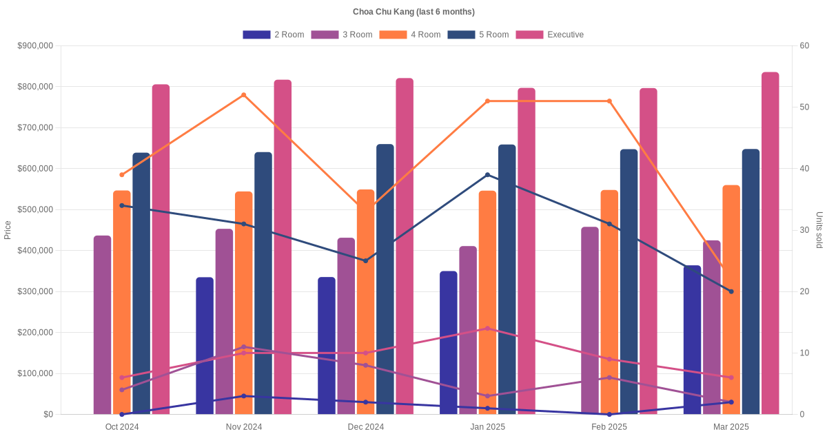 Choa Chu Kang comprises 2 room, 3 room, 4 room, 5 room and executive HDB units. Shown below are the transactions volume trend summary and graph, broken down by month.