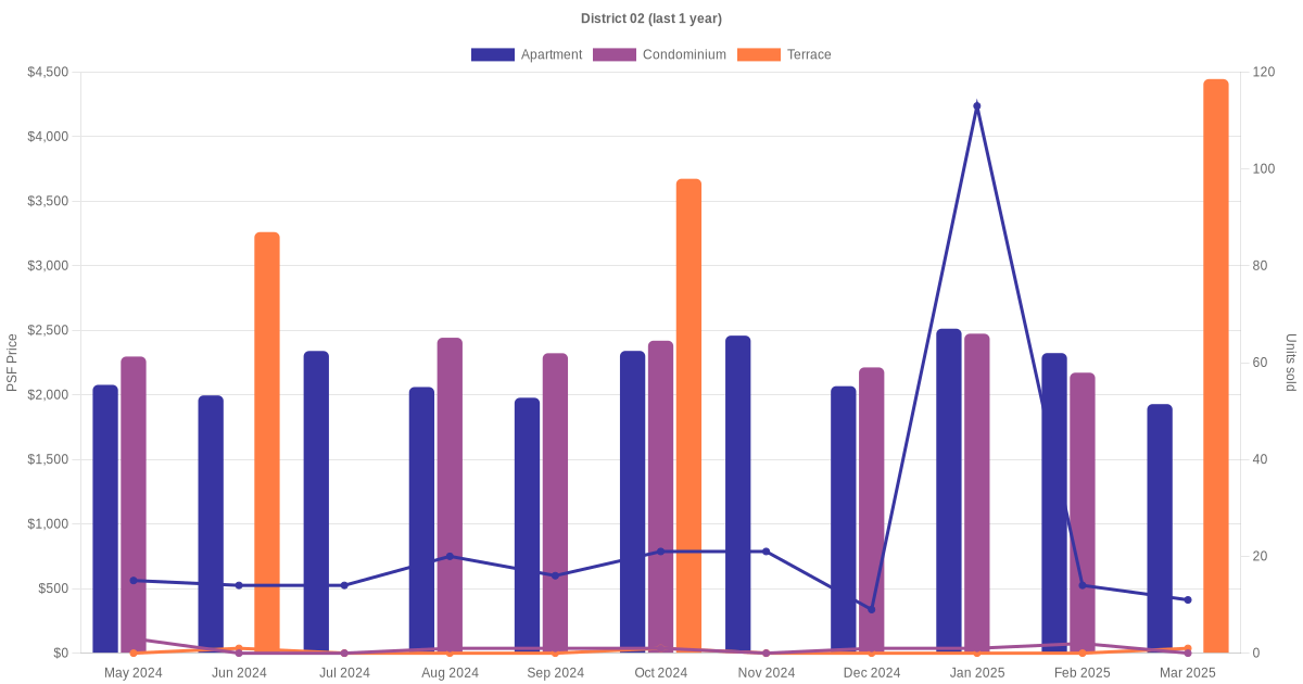 In the last 3 years, the average monthly transacted sale price trend for apartment, condominium and terrace units in district 02 has been summarised as shown below.