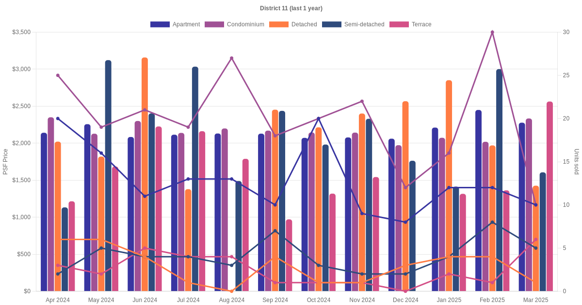 In the last 3 years, the average monthly transacted sale price trend for apartment, condominium, detached, semi-detached and terrace units in district 11 has been summarised as shown below.