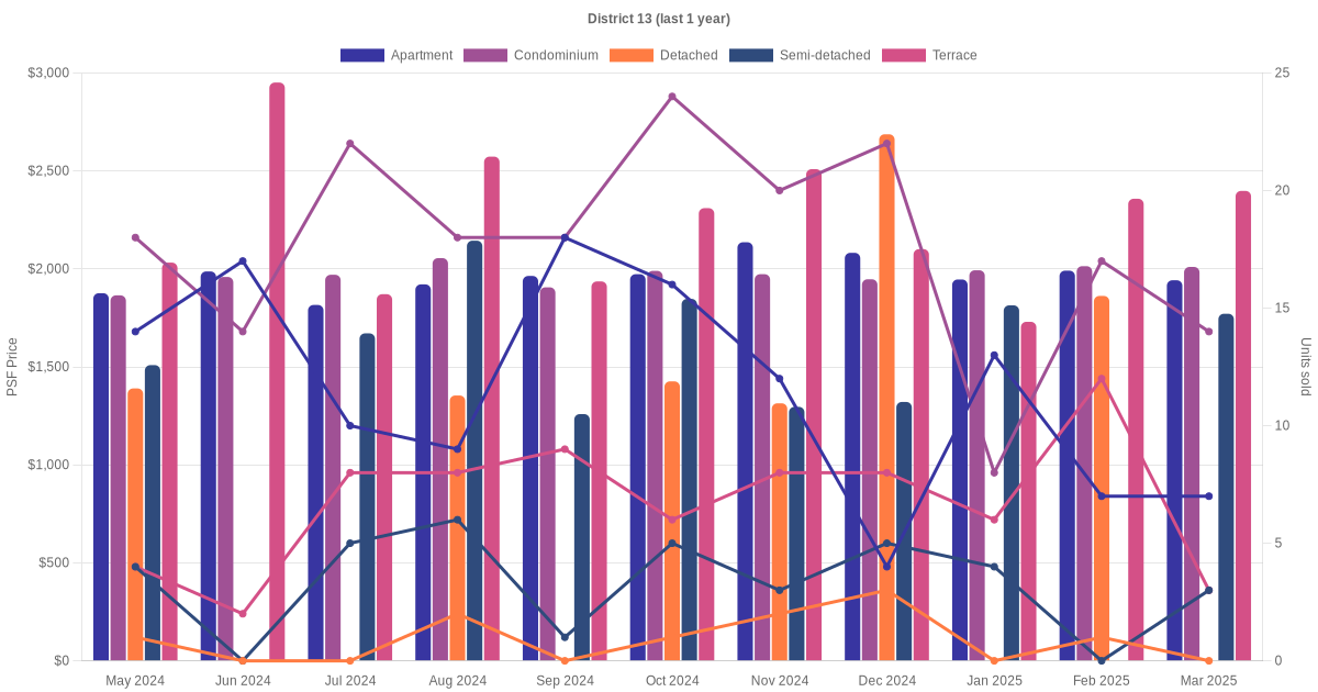In the last 3 years, the average monthly transacted sale price trend for apartment, condominium, detached, semi-detached and terrace units in district 13 has been summarised as shown below.