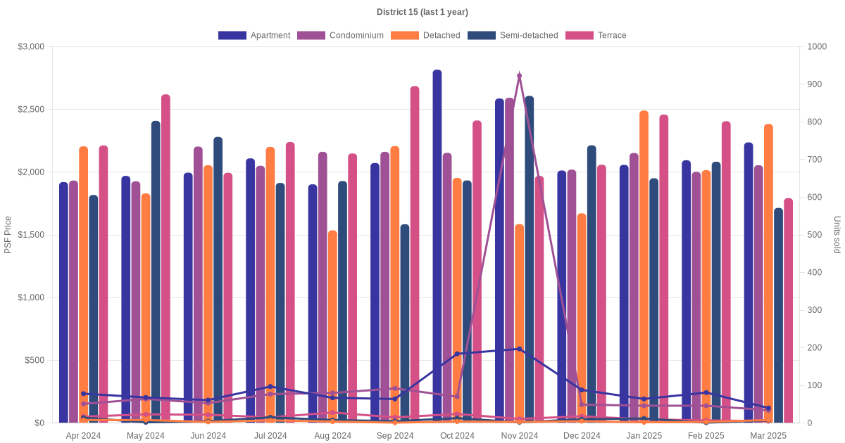 In the last 3 years, the average monthly transacted sale price trend for apartment, condominium, detached, semi-detached and terrace units in district 15 has been summarised as shown below.