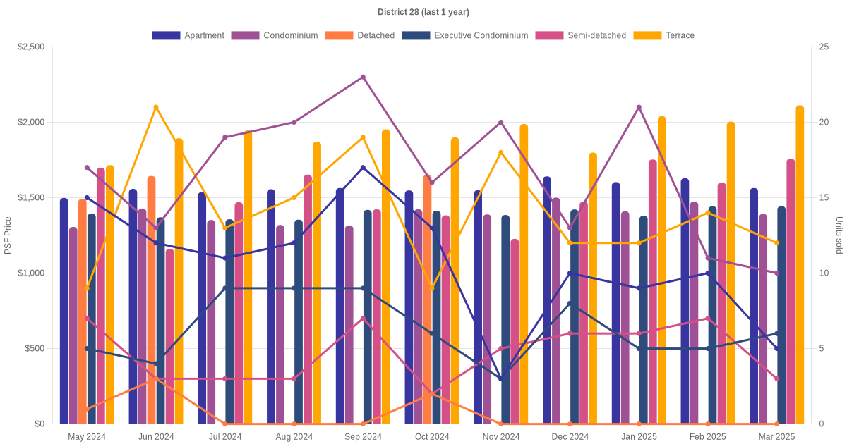 The graph below shows the apartment, condominium, detached, executive condominium, non-landed properties, semi-detached and terrace units' rental transactions trend in district 28.