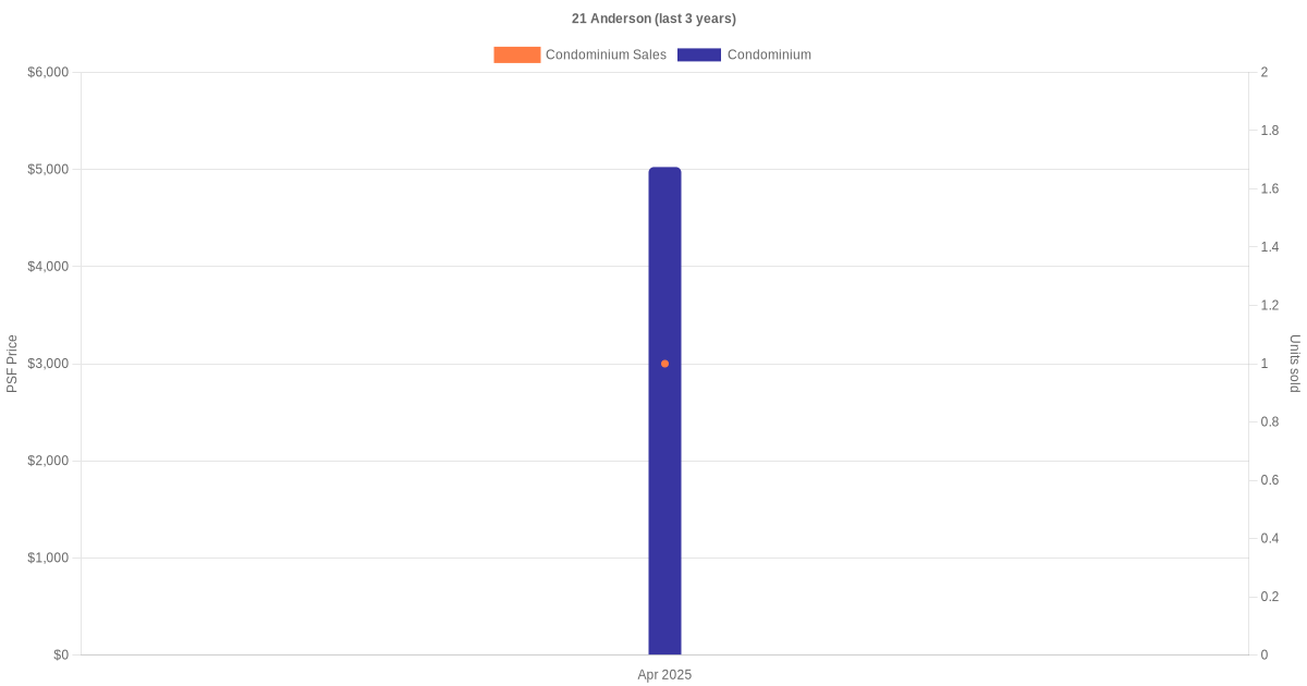 There were a total of 13 sales transactions for 21 Anderson in the last 3 years, with the latest one recorded in Dec 2025. Disclaimer : our transactions data below does not include block numbers as the data is not available.