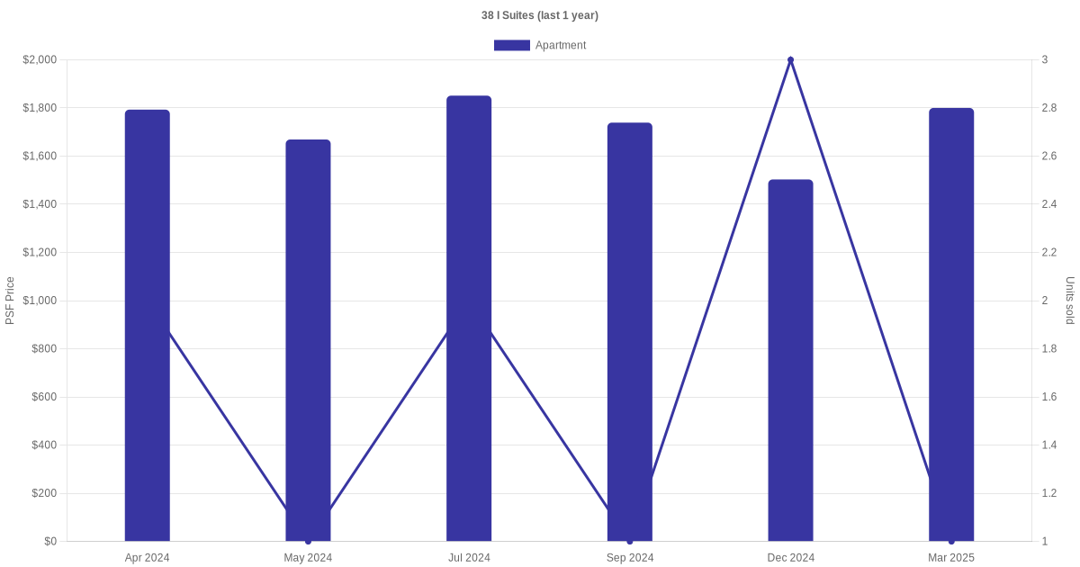 There were a total of 19 sales transactions for 38 I Suites in the last 3 years, with the latest one recorded in Sep 2025. Disclaimer : our transactions data below does not include block numbers as the data is not available.