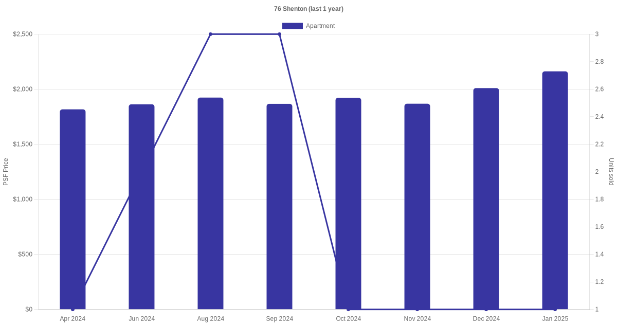 The graph below shows the average monthly transacted sale price for each of the apartment units for 76 Shenton in the last 3 years. This is based on the transactional data collated for 76 Shenton for the selected period.