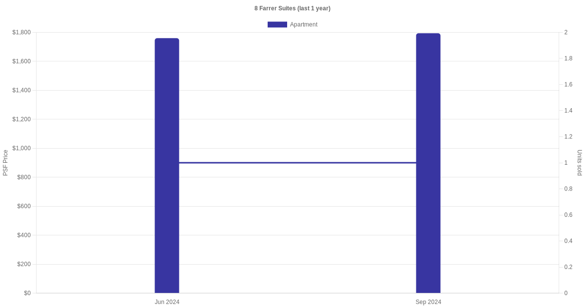 There were a total of 5 sales transactions for 8 Farrer Suites in the last 3 years, with the latest one recorded in Sep 2024. Disclaimer : our transactions data below does not include block numbers as the data is not available.