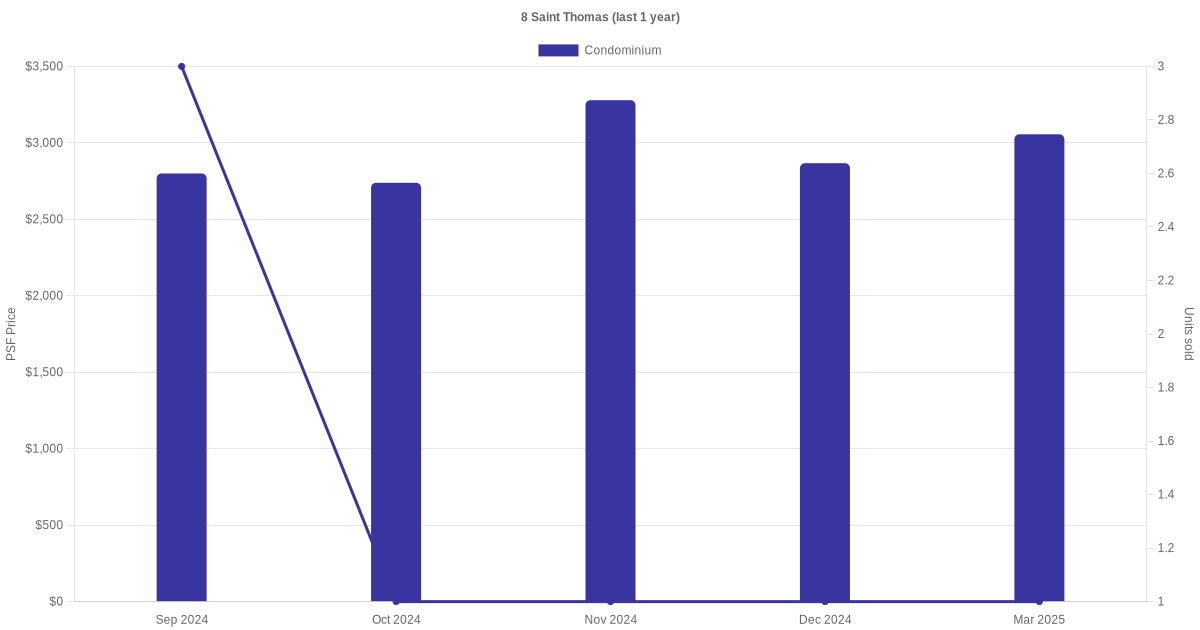 There were a total of 13 sales transactions for 8 Saint Thomas in the last 3 years, with the latest one recorded in Sep 2025. Disclaimer : our transactions data below does not include block numbers as the data is not available.