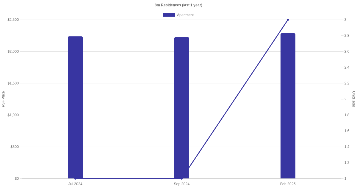 There were a total of 17 sales transactions for 8m Residences in the last 3 years, with the latest one recorded in Sep 2025. Disclaimer : our transactions data below does not include block numbers as the data is not available.