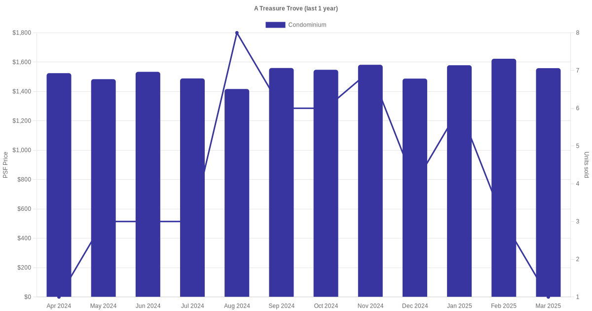 The graph below shows the average monthly transacted sale price for each of the condominium units for A Treasure Trove in the last 3 years. This is based on the transactional data collated for A Treasure Trove for the selected period.