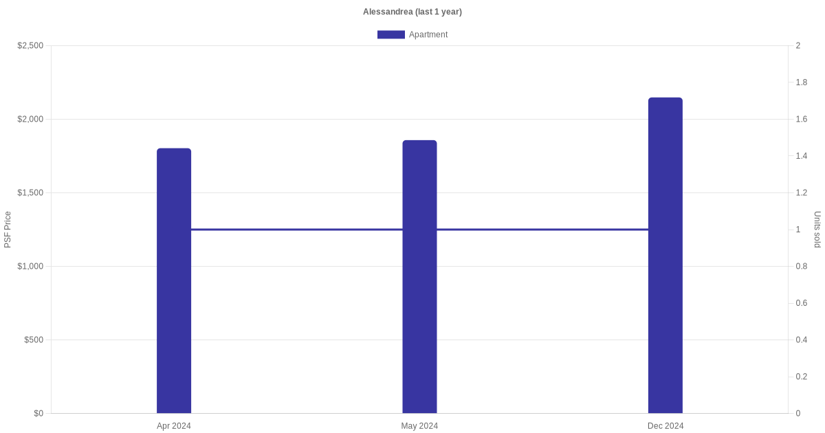 There were a total of 11 sales transactions for Alessandrea in the last 3 years, with the latest one recorded in Aug 2025. Disclaimer : our transactions data below does not include block numbers as the data is not available.