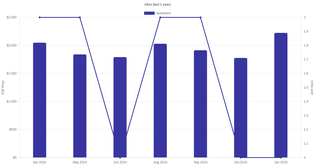 The graph below shows the average monthly transacted sale price for each of the apartment units for Altez in the last 3 years. This is based on the transactional data collated for Altez for the selected period.