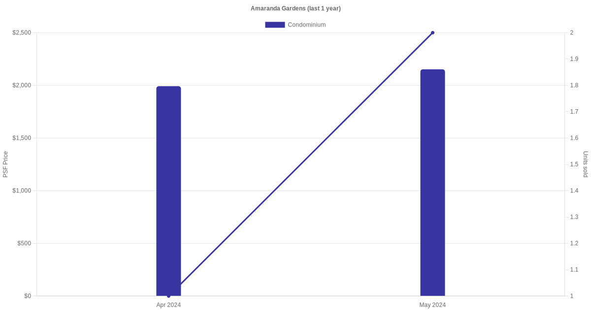 The graph below shows the average monthly transacted sale price for each of the condominium units for Amaranda Gardens in the last 3 years. This is based on the transactional data collated for Amaranda Gardens for the selected period.