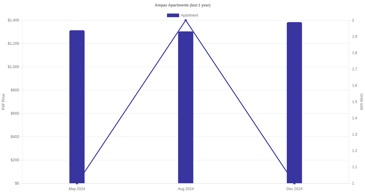 There were a total of 6 sales transactions for Ampas Apartments in the last 3 years, with the latest one recorded in Dec 2024. Disclaimer : our transactions data below does not include block numbers as the data is not available.