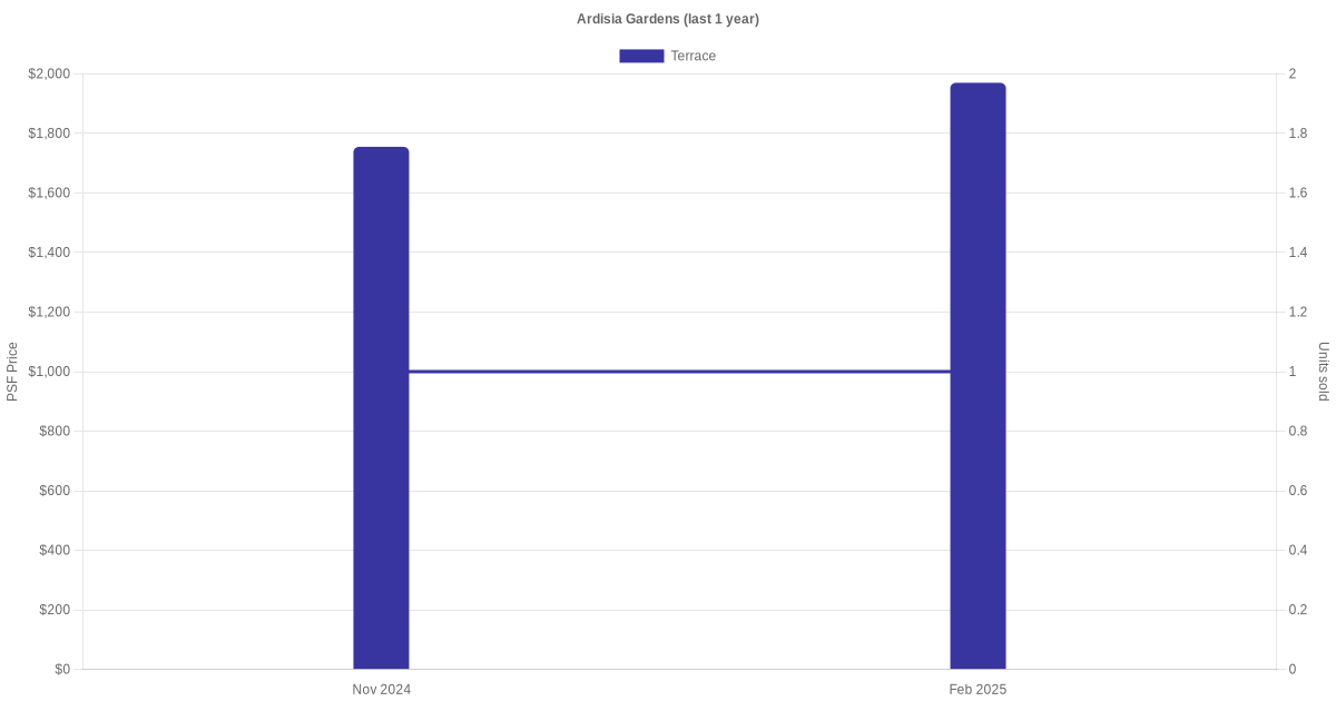 There were a total of 5 sales transactions for Ardisia Gardens in the last 3 years, with the latest one recorded in Feb 2025. Disclaimer : our transactions data below does not include block numbers as the data is not available.