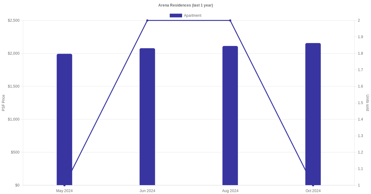 There were a total of 16 sales transactions for Arena Residences in the last 3 years, with the latest one recorded in Oct 2025. Disclaimer : our transactions data below does not include block numbers as the data is not available.