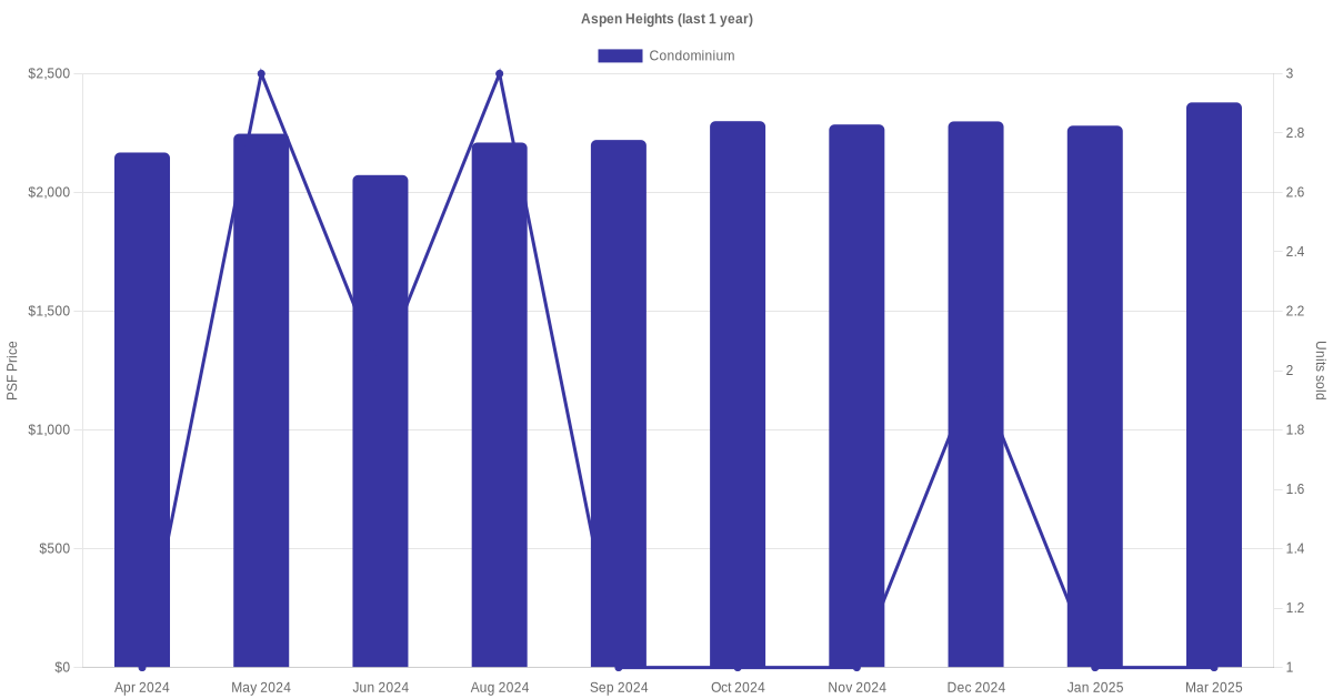 There were a total of 40 sales transactions for Aspen Heights in the last 3 years, with the latest one recorded in Jan 2026. Disclaimer : our transactions data below does not include block numbers as the data is not available. If you would like to see a list of blocks / addresses associated with Aspen Heights, please click here.