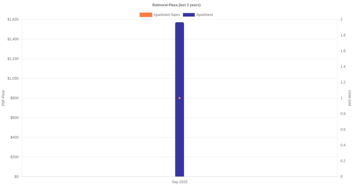 There were a total of 1 sales transactions for Balmoral Plaza in the last 3 years, with the latest one recorded in Sep 2025. Disclaimer : our transactions data below does not include block numbers as the data is not available. If you would like to see a list of blocks / addresses associated with Balmoral Plaza, please click here.