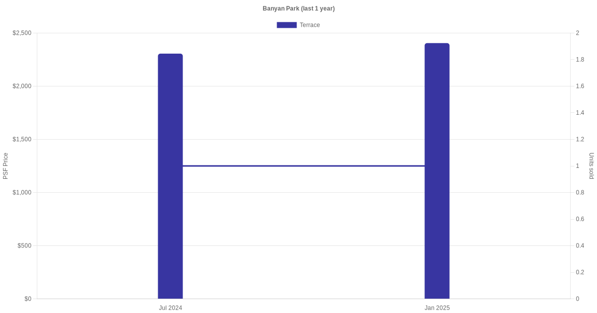 There were a total of 2 sales transactions for Banyan Park in the last 3 years, with the latest one recorded in Jan 2025. Disclaimer : our transactions data below does not include block numbers as the data is not available.