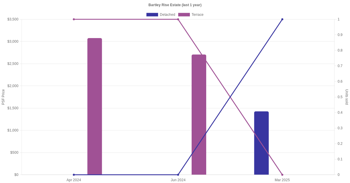 The graph below shows the average monthly transacted sale price for each of the detached and terrace units for Bartley Rise Estate in the last 3 years. This is based on the transactional data collated for Bartley Rise Estate for the selected period.