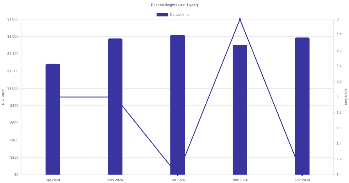 The graph below shows the average monthly transacted sale price for each of the condominium units for Beacon Heights in the last 3 years. This is based on the transactional data collated for Beacon Heights for the selected period.