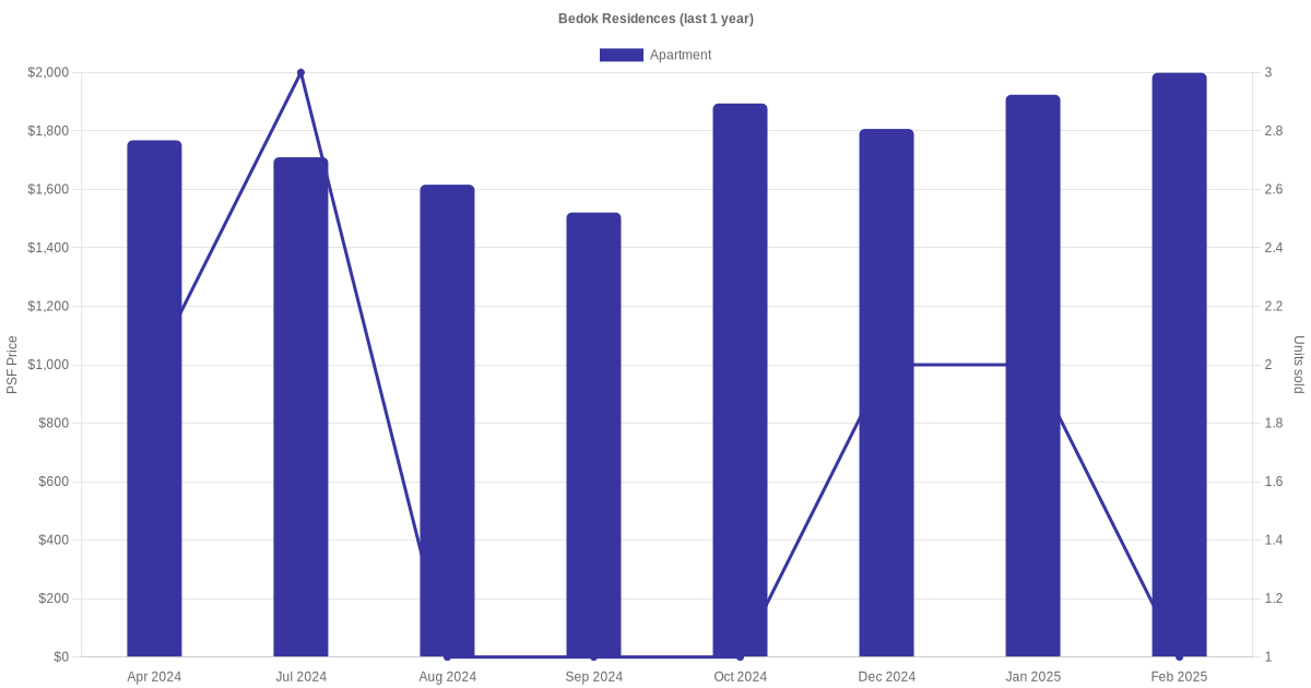 Compare sales, rental and their respective PSF price trends of Bedok Residences and other nearby private property projects within 2km.