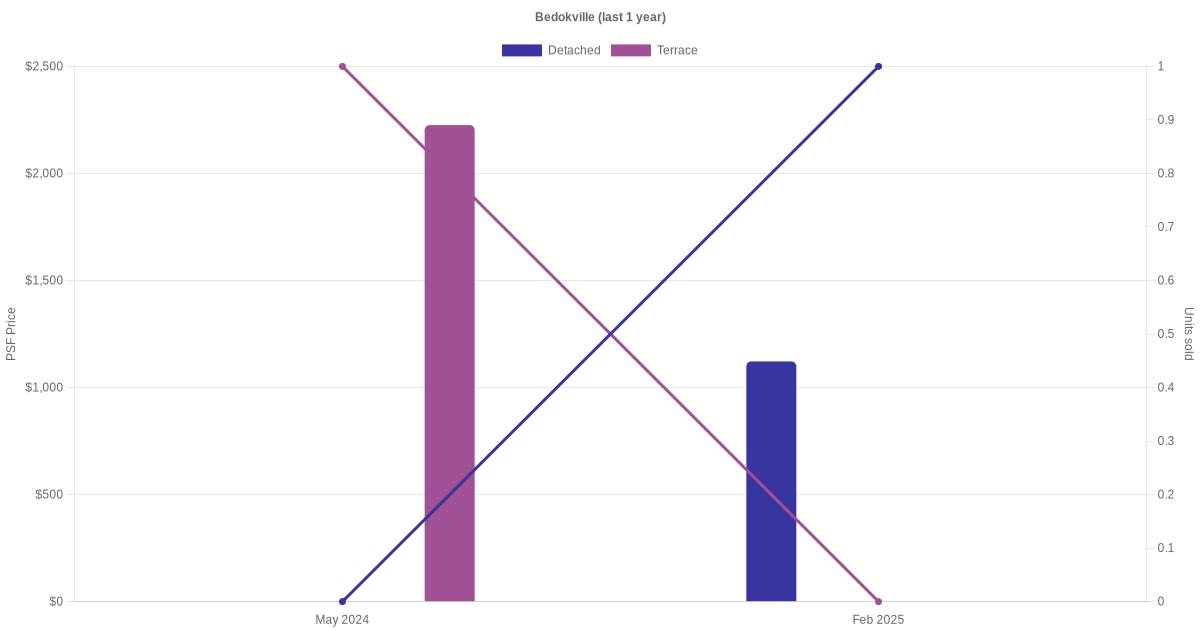 The graph below shows the average monthly transacted sale price for each of the detached, semi-detached and terrace units for Bedokville in the last 3 years. This is based on the transactional data collated for Bedokville for the selected period.
