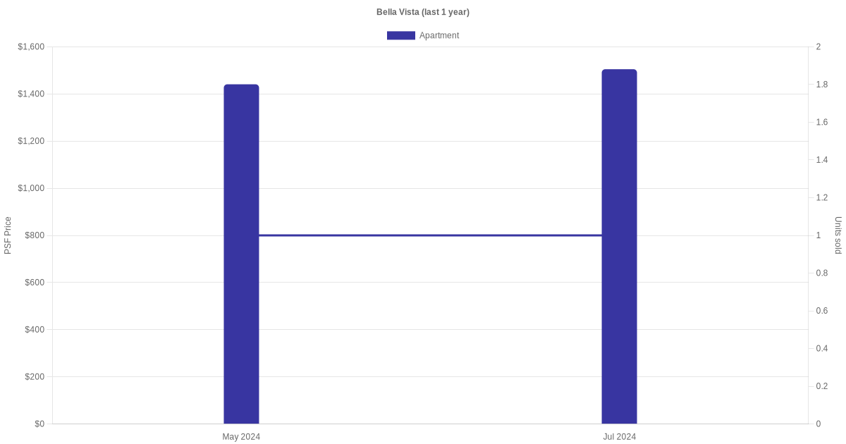 There were a total of 4 sales transactions for Bella Vista in the last 3 years, with the latest one recorded in Jul 2024. Disclaimer : our transactions data below does not include block numbers as the data is not available.