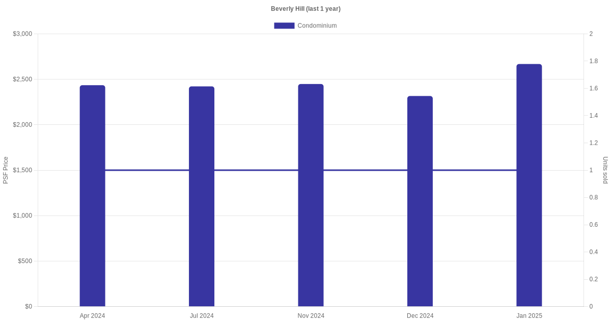 The graph below shows the average monthly transacted sale price for each of the condominium units for Beverly Hill in the last 3 years. This is based on the transactional data collated for Beverly Hill for the selected period.