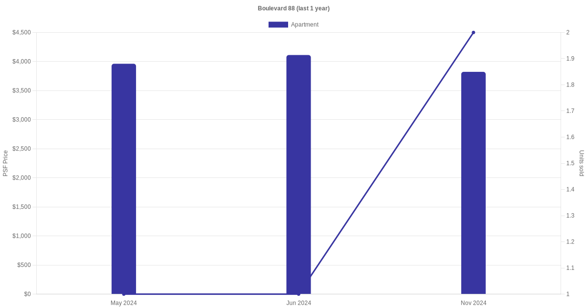 The graph below shows the average monthly transacted sale price for each of the apartment units for Boulevard 88 in the last 3 years. This is based on the transactional data collated for Boulevard 88 for the selected period.