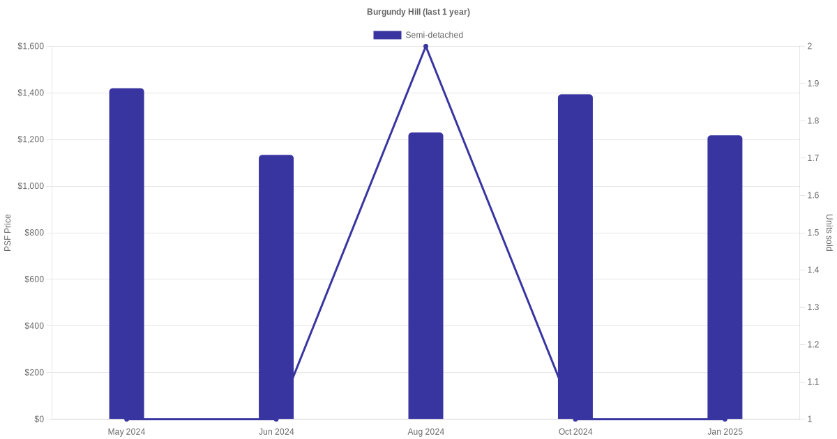 The graph below shows the average monthly transacted sale price for each of the semi-detached units for Burgundy Hill in the last 3 years. This is based on the transactional data collated for Burgundy Hill for the selected period.
