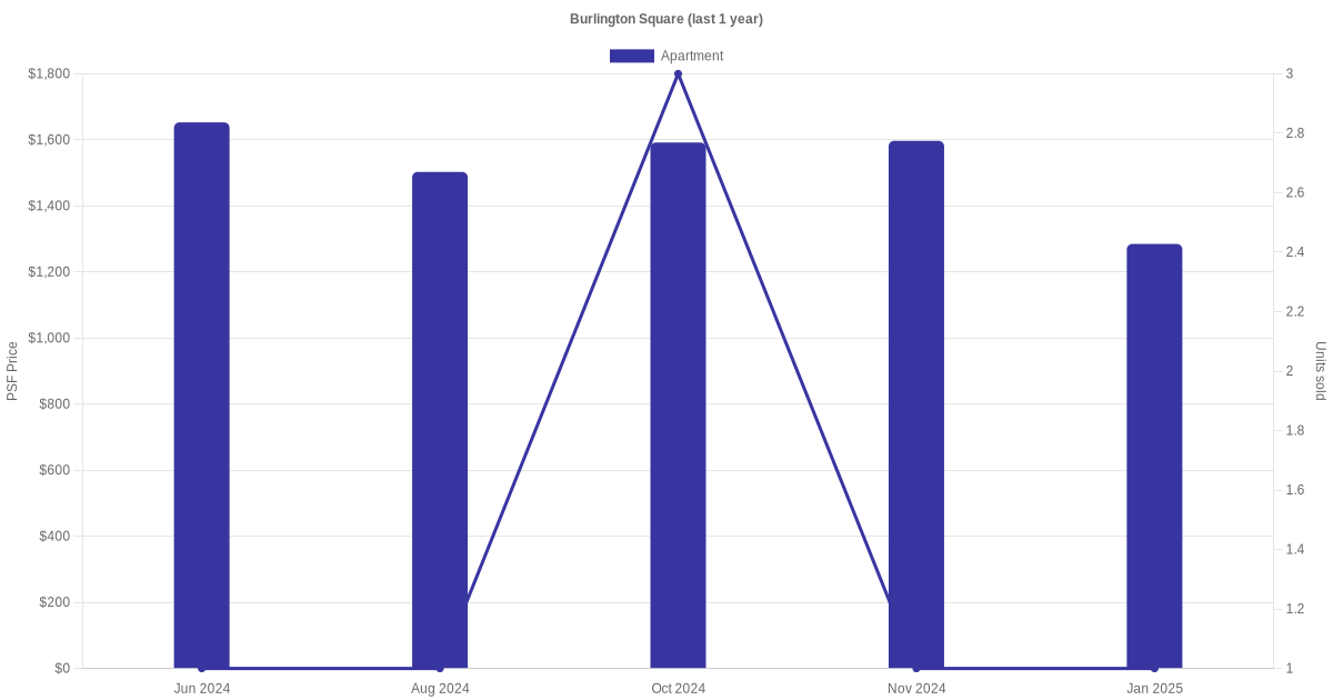 The graph below shows the average monthly transacted sale price for each of the apartment units for Burlington Square in the last 3 years. This is based on the transactional data collated for Burlington Square for the selected period.