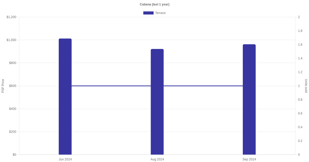 The graph below shows the average monthly transacted sale price for each of the terrace units for Cabana in the last 3 years. This is based on the transactional data collated for Cabana for the selected period.