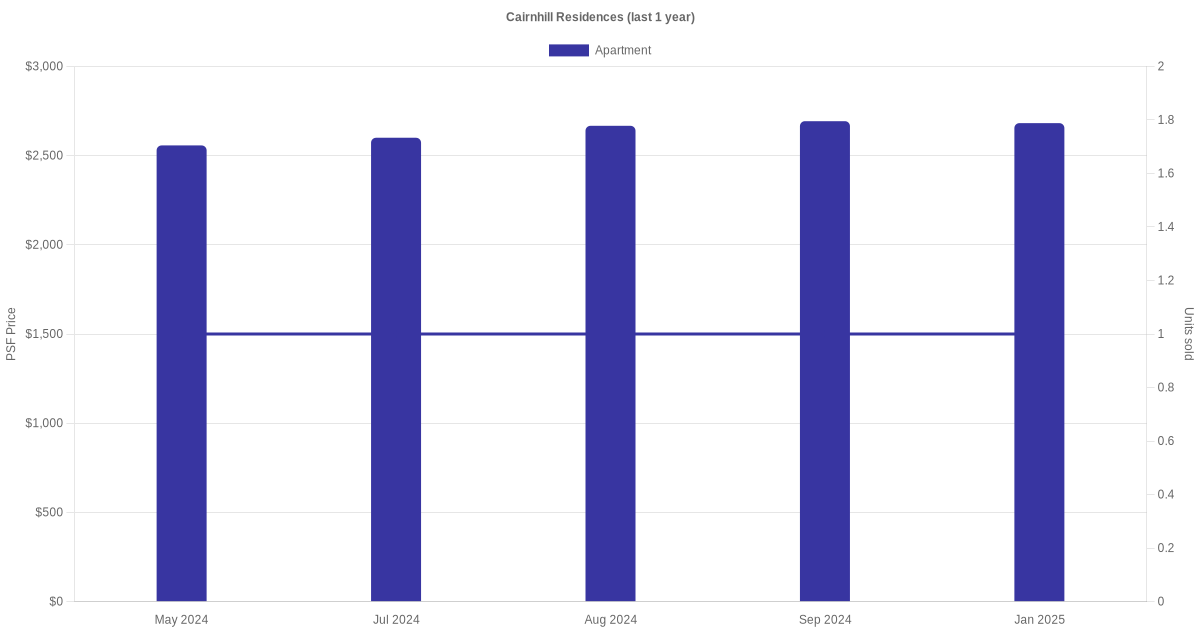 There were a total of 12 sales transactions for Cairnhill Residences in the last 3 years, with the latest one recorded in Dec 2025. Disclaimer : our transactions data below does not include block numbers as the data is not available.