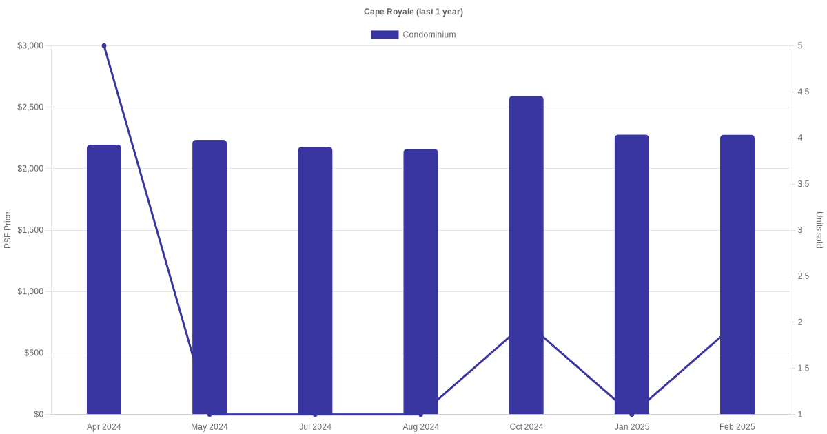 There were a total of 64 sales transactions for Cape Royale in the last 3 years, with the latest one recorded in Nov 2025. Disclaimer : our transactions data below does not include block numbers as the data is not available. If you would like to see a list of blocks / addresses associated with Cape Royale, please click here.