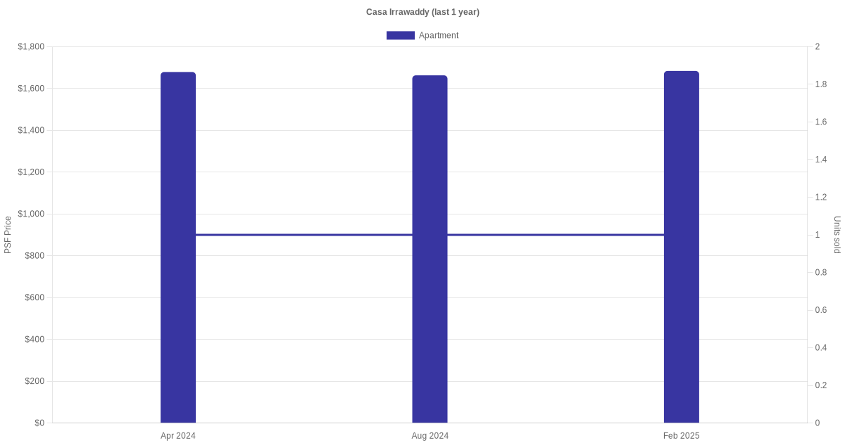 There were a total of 5 sales transactions for Casa Irrawaddy in the last 3 years, with the latest one recorded in Oct 2025. Disclaimer : our transactions data below does not include block numbers as the data is not available.