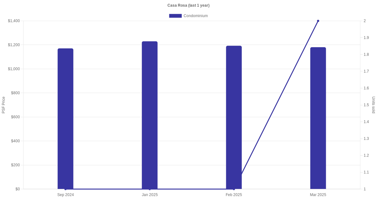 There were a total of 12 sales transactions for Casa Rosa in the last 3 years, with the latest one recorded in Jul 2025. Disclaimer : our transactions data below does not include block numbers as the data is not available.