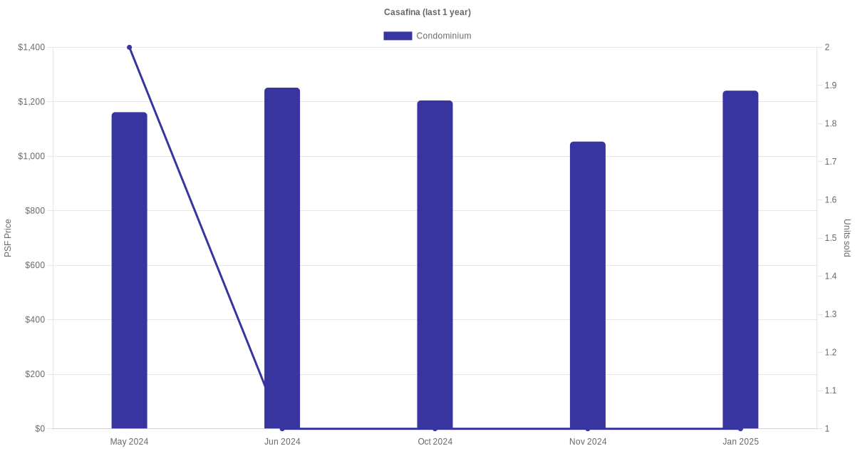 There were a total of 28 sales transactions for Casafina in the last 3 years, with the latest one recorded in Dec 2025. Disclaimer : our transactions data below does not include block numbers as the data is not available.