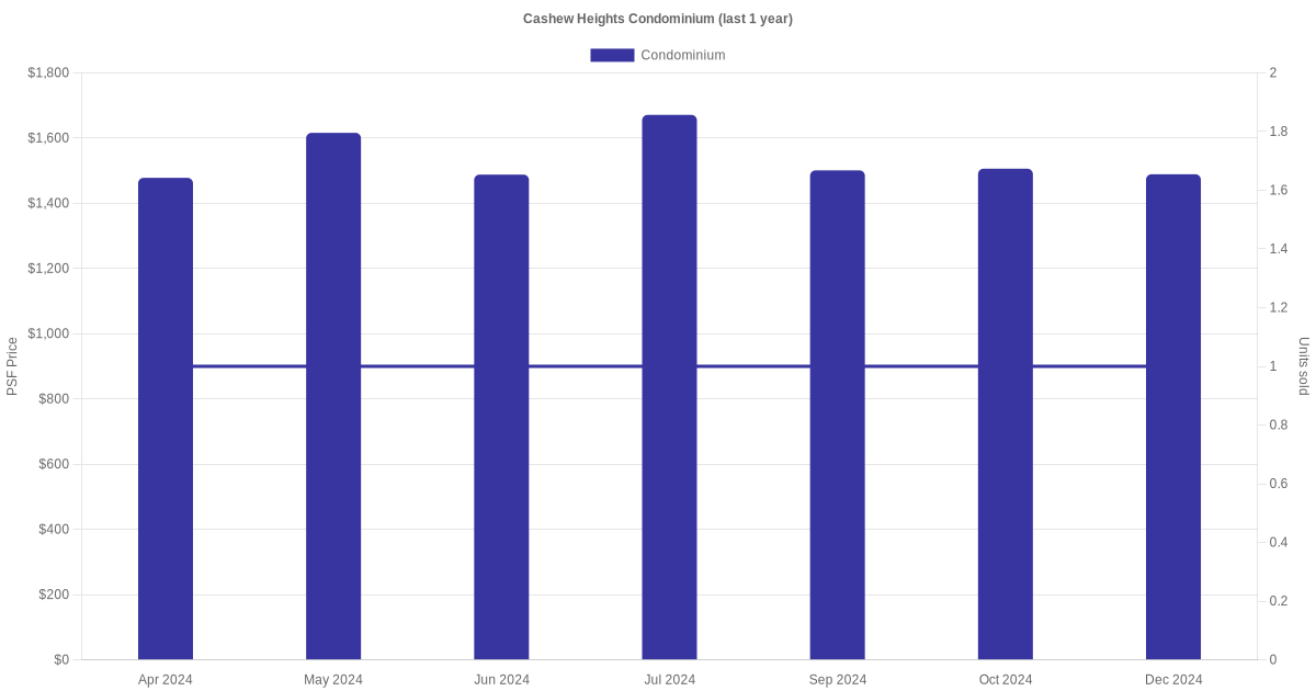 The graph below shows the average monthly transacted sale price for each of the condominium units for Cashew Heights Condominium in the last 3 years. This is based on the transactional data collated for Cashew Heights Condominium for the selected period.